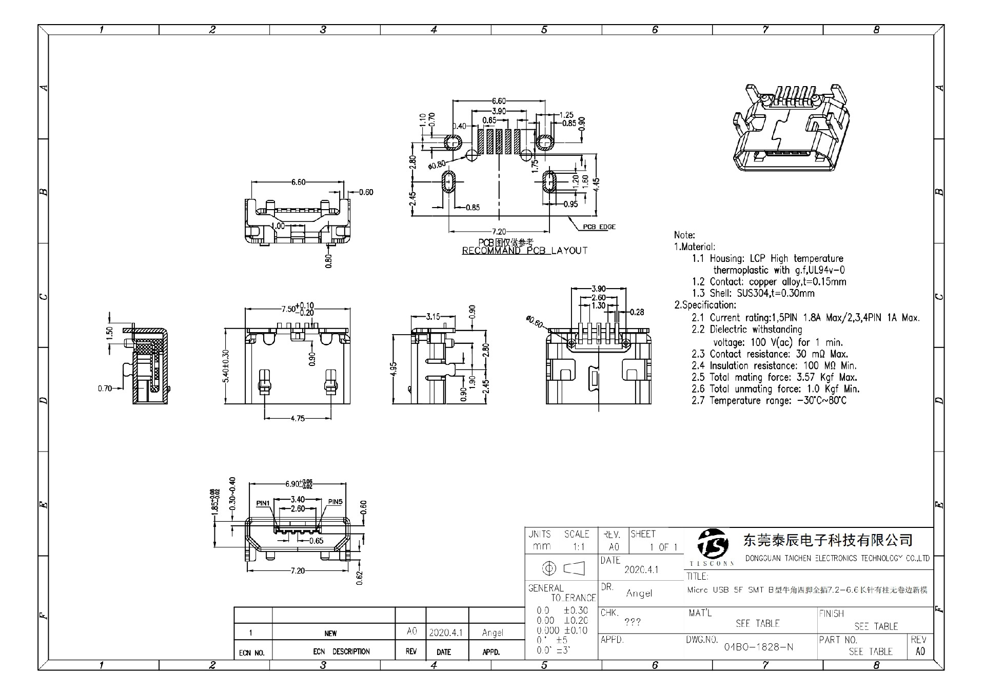 04BO-1828-N Micro USB 5F SMT B型牛角四腳全插7.2-6.6長針有柱無卷邊新模