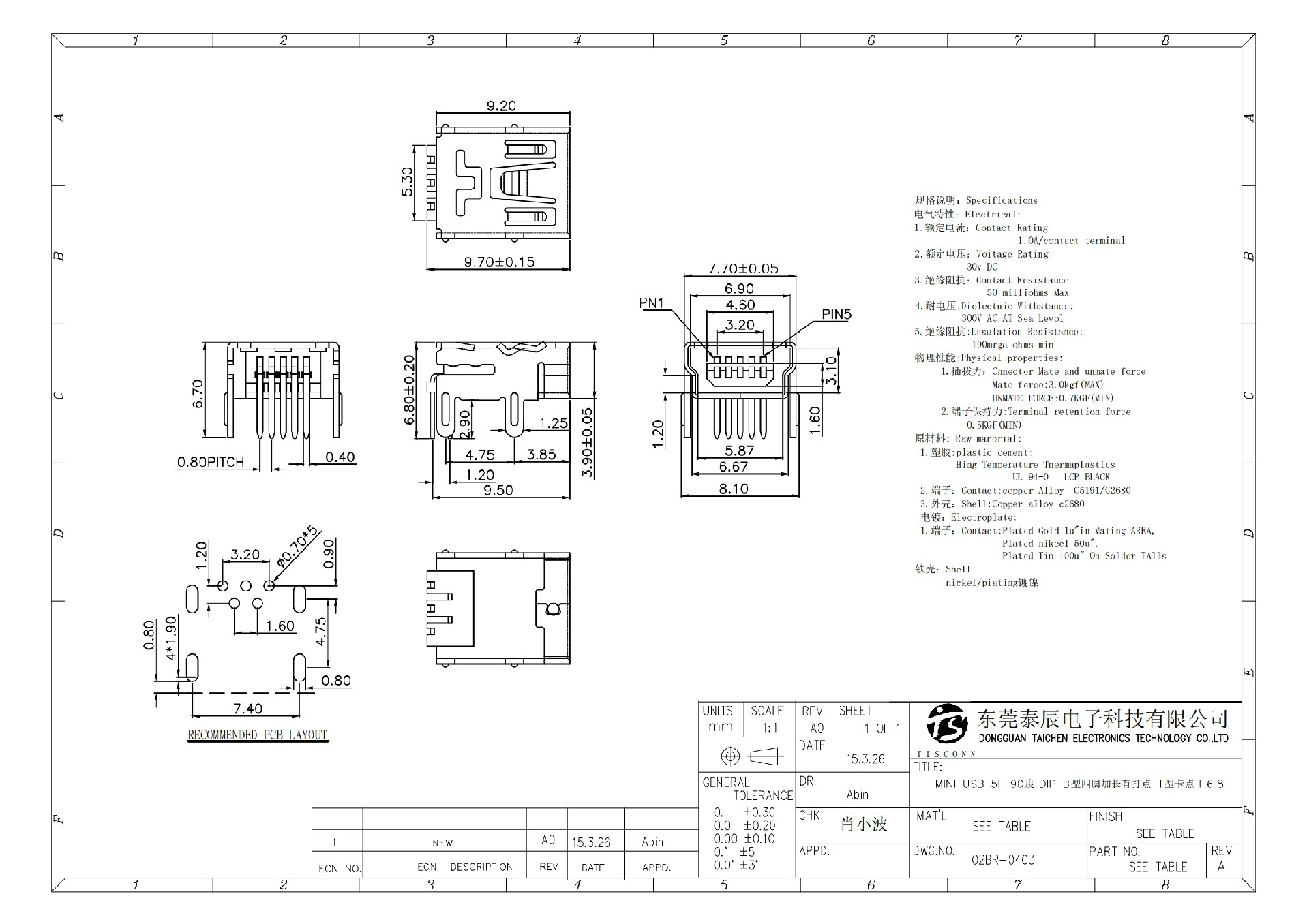 02BR-1106 MINI USB 5F 90度 DIP B型四腳加長(zhǎng)有打點(diǎn) T型卡點(diǎn) H6.8